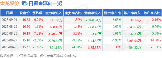 证券之星消息,截至2025年9月1日收盘,太龙股份(300650)报收于16.63元,上涨0.79%,换手率10.43%,成交量17.76万手,成交额2.95亿元。