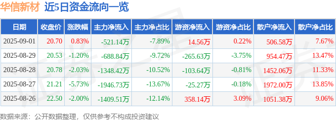证券之星消息,截至2025年9月1日收盘,华信新材(300717)报收于20.7元,上涨0.83%,换手率3.13%,成交量3.19万手,成交额6605.37万元。