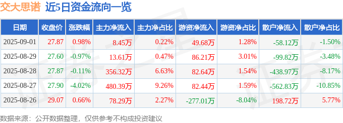 证券之星消息,截至2025年9月1日收盘,交大思诺(300851)报收于27.87元,上涨0.98%,换手率2.55%,成交量1.38万手,成交额3866.52万元。
