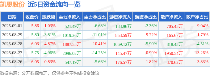 证券之星消息,截至2025年9月1日收盘,凯恩股份(002012)报收于5.86元,上涨1.03%,换手率2.87%,成交量13.39万手,成交额7806.73万元。