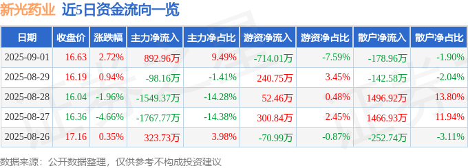 证券之星消息,截至2025年9月1日收盘,新光药业(300519)报收于16.63元,上涨2.72%,换手率5.0%,成交量5.7万手,成交额9407.77万元。