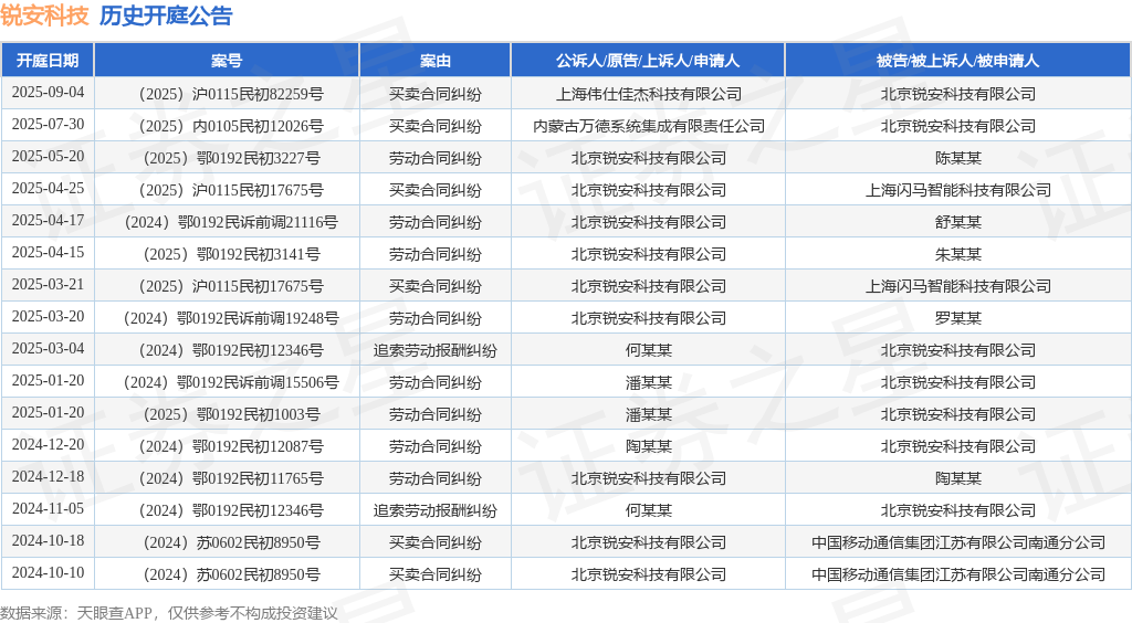 案号:(2025)沪0115民初82259号根据统计,近一年内以北京锐安科技有限公司为当事人的历史开庭公告有16则,其中案由为“劳动合同纠纷”的公告以8则居首,其次为“买卖合同纠纷”有6则,“追索劳动报酬纠纷”有2则。历史开庭公告如下: