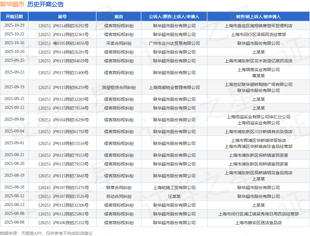 案号:(2025)沪0115民初61793号根据统计,近一年内以联华超市股份有限公司为当事人的历史开庭公告有137则,其中案由为“侵害商标权纠纷”的公告以86则居首,其次为“商标权权属、侵权纠纷”有10则,“买卖合同纠纷”有9则。历史开庭公告(前20条)如下: