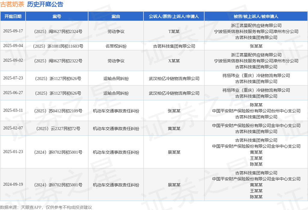 案号:(2025)浙1081民初11603号根据统计,近一年内以古茗科技集团有限公司为当事人的历史开庭公告有9则,其中案由为“机动车交通事故责任纠纷”的公告以4则居首,其次为“劳动争议”有2则,“运输合同纠纷”有2则。历史开庭公告如下: