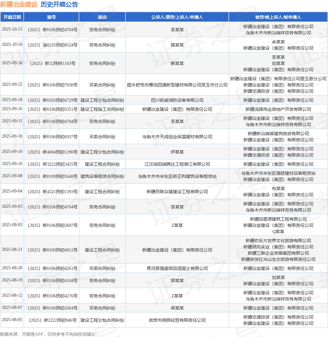 案号:(2025)新4321民初1393号根据统计,近一年内以新疆冶金建设(集团)有限责任公司为当事人的历史开庭公告有127则,其中案由为“买卖合同纠纷”的公告以27则居首,其次为“建设工程施工合同纠纷”有23则,“劳务合同纠纷”有18则。历史开庭公告(前20条)如下: