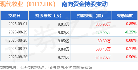 证券之星消息,9月1日南向资金增持835.9万股现代牧业(01117.HK)。近5个交易日中,获南向资金增持的有4天,累计净增持1911.6万股。近20个交易日中,获南向资金增持的有17天,累计净增持1.52亿股。截至目前,南向资金持有现代牧业(01117.HK)9.91亿股,占公司已发行普通股的12.5%。