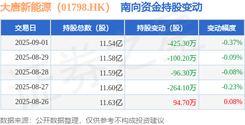 证券之星消息,9月1日南向资金减持425.3万股大唐新能源(01798.HK)。近5个交易日中,获南向资金减持的有4天,累计净减持791.2万股。近20个交易日中,获南向资金减持的有11天,累计净减持1007.5万股。截至目前,南向资金持有大唐新能源(01798.HK)11.54亿股,占公司已发行普通股的46.14%。