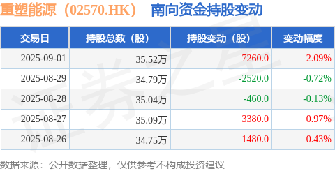 证券之星消息,9月1日南向资金增持7260.0股重塑能源(02570.HK)。近5个交易日中,获南向资金增持的有3天,累计净增持9140.0股。近20个交易日中,获南向资金增持的有12天,累计净增持6.24万股。截至目前,南向资金持有重塑能源(02570.HK)35.52万股,占公司已发行普通股的0.86%。