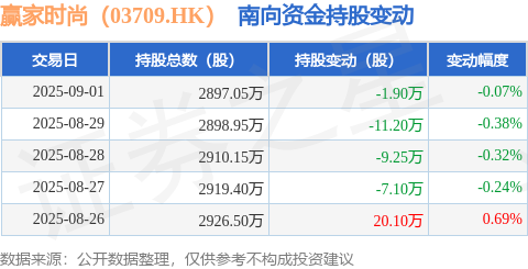 证券之星消息,9月1日南向资金减持1.9万股赢家时尚(03709.HK)。近5个交易日中,获南向资金减持的有4天,累计净减持9.35万股。近20个交易日中,获南向资金减持的有16天,累计净减持46.2万股。截至目前,南向资金持有赢家时尚(03709.HK)2897.05万股,占公司已发行普通股的4.11%。