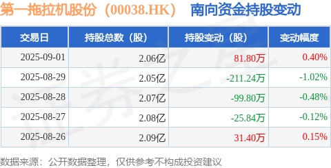 证券之星消息,9月1日南向资金增持81.8万股第一拖拉机股份(00038.HK)。近5个交易日中,获南向资金减持的有3天,累计净减持223.68万股。近20个交易日中,获南向资金减持的有9天,累计净减持40.48万股。截至目前,南向资金持有第一拖拉机股份(00038.HK)2.06亿股,占公司已发行普通股的52.6%。