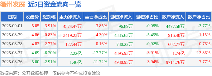 证券之星消息,截至2025年9月1日收盘,衢州发展(600208)报收于5.05元,上涨3.91%,换手率2.8%,成交量238.6万手,成交额11.88亿元。