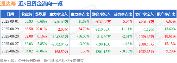 证券之星消息,截至2025年9月1日收盘,通达海(301378)报收于35.93元,下跌6.68%,换手率42.87%,成交量19.68万手,成交额7.22亿元。
