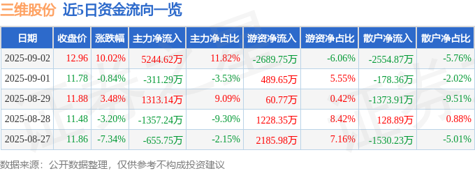 9月2日的资金流向数据方面,主力资金净流入5244.62万元,占总成交额11.82%,游资资金净流出2689.75万元,占总成交额6.06%,散户资金净流出2554.87万元,占总成交额5.76%。