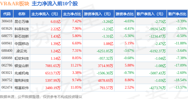 从资金流向上来看,当日VR&AR板块主力资金净流出173.51亿元,游资资金净流入29.61亿元,散户资金净流入143.9亿元。VR&AR板块个股资金流向见下表: