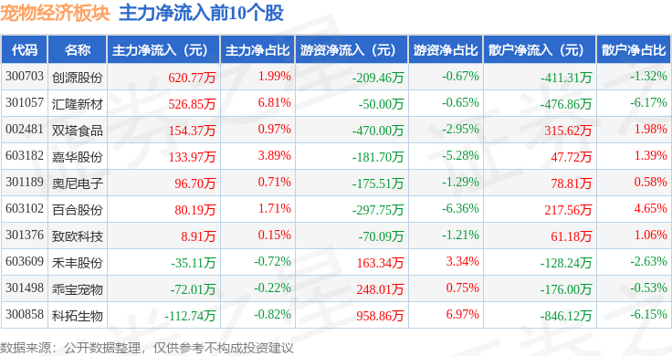 从资金流向上来看,当日宠物经济板块主力资金净流出8.36亿元,游资资金净流入624.43万元,散户资金净流入8.3亿元。宠物经济板块个股资金流向见下表: