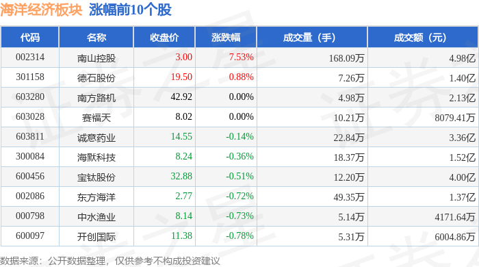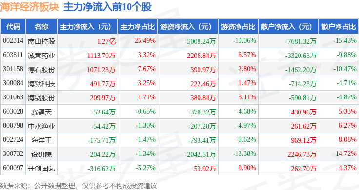 从资金流向上来看,当日海洋经济板块主力资金净流出27.59亿元,游资资金净流入3.1亿元,散户资金净流入24.49亿元。海洋经济板块个股资金流向见下表: