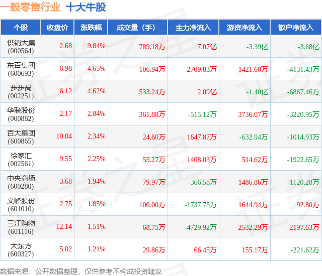 个股表现方面,一般零售行业当日领涨股为供销大集(000564),该股当日报收2.68,上涨9.84%,成交量789.18万,主力资金净流入7.07亿元。东百集团(600693)以上涨4.65%紧随其后,该股当日成交量106.94万,主力资金净流入2709.83万元。除此之外,步步高(002251)、华联股份(000882)、百大集团(600865)均进入当日牛股之列。具体个股列表见下表:
