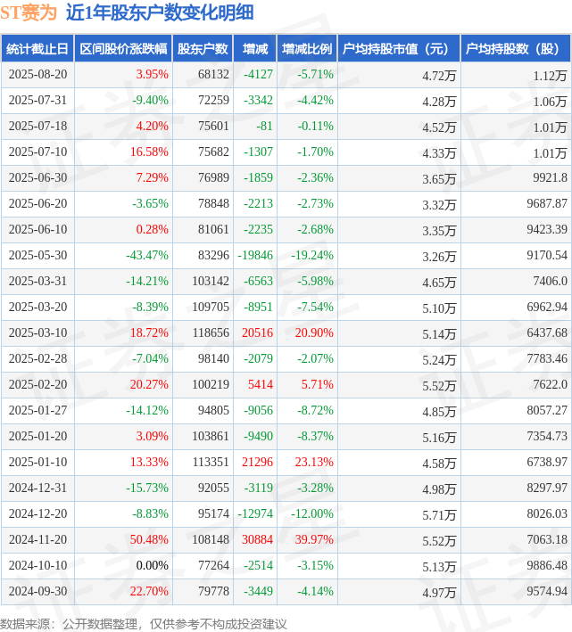 从股价来看,2025年7月31日至2025年8月20日,ST赛为区间涨幅为3.95%,在此期间股东户数减少4127.0户,减幅为5.71%。