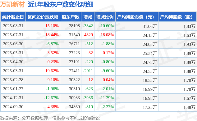 从股价来看,2025年7月31日至2025年8月31日,万凯新材区间涨幅为15.1%,在此期间股东户数减少3342.0户,减幅为10.6%。