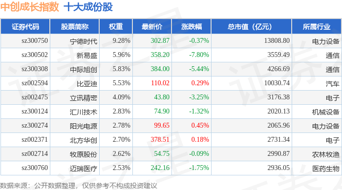 中创成长(399626)指数十大成份股详情如下: