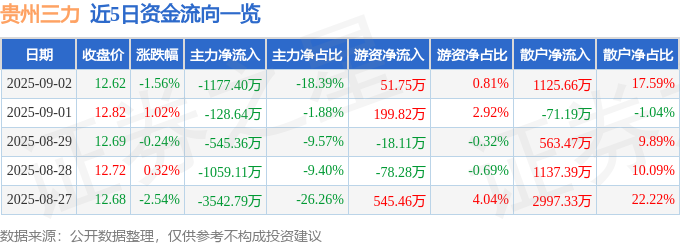 证券之星消息,截至2025年9月2日收盘,贵州三力(603439)报收于12.62元,下跌1.56%,换手率1.25%,成交量5.06万手,成交额6401.09万元。