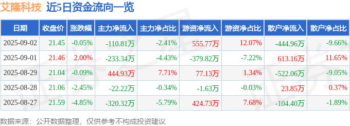 证券之星消息,截至2025年9月2日收盘,艾隆科技(688329)报收于21.45元,下跌0.05%,换手率2.84%,成交量2.19万手,成交额4605.95万元。