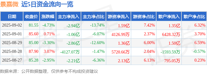 证券之星消息,截至2025年9月2日收盘,景嘉微(300474)报收于81.55元,下跌4.73%,换手率6.37%,成交量25.89万手,成交额21.41亿元。
