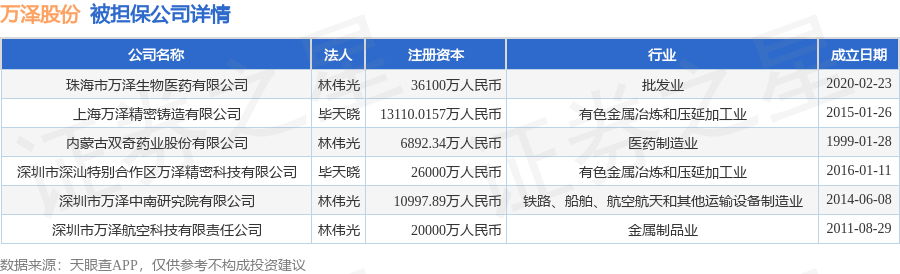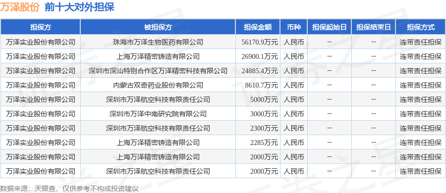 万泽股份8月22日披露21笔对外担保,被担保公司7家。担保金额排在前十的对外担保明细如下表: