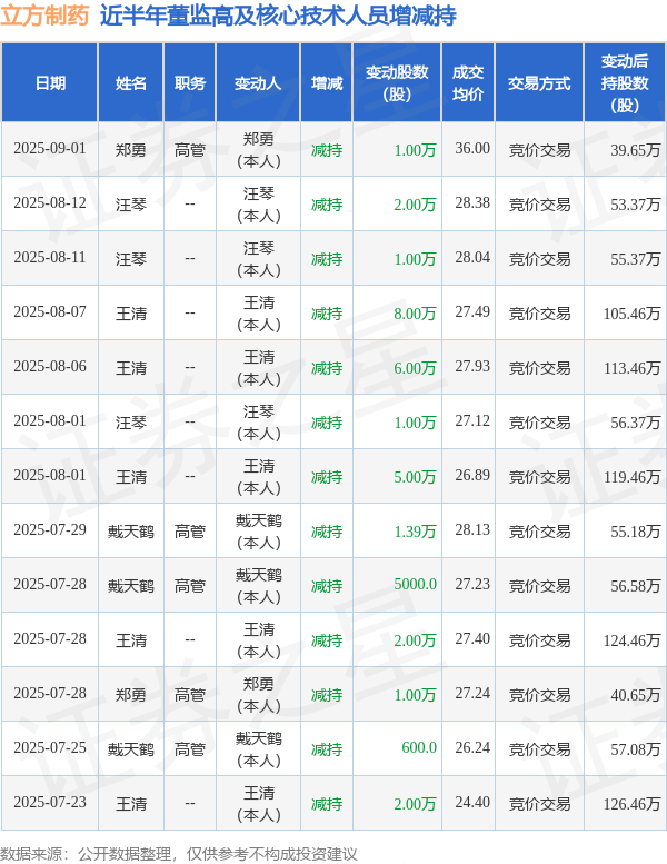 立方制药近半年内的董监高及核心技术人员增减持详情如下: