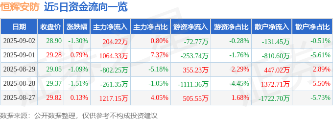 证券之星消息,截至2025年9月2日收盘,恒辉安防(300952)报收于28.9元,下跌1.3%,换手率8.59%,成交量9.0万手,成交额2.56亿元。