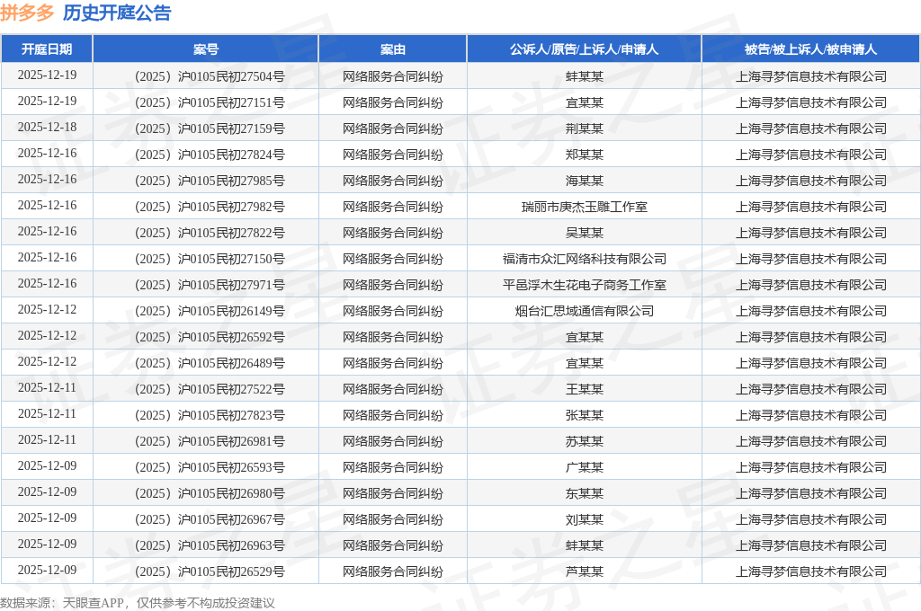 案号:(2025)沪0105民初14845号根据统计,近一年内以上海寻梦信息技术有限公司为当事人的历史开庭公告有21716则,其中案由为“侵害商标权纠纷”的公告以6597则居首,其次为“网络服务合同纠纷”有4500则,“侵害作品发行权纠纷”有4243则。历史开庭公告(前20条)如下: