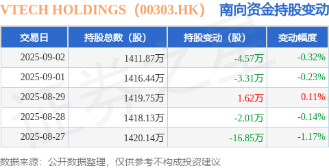 证券之星消息,9月2日南向资金减持4.57万股VTECH HOLDINGS(00303.HK)。近5个交易日中,获南向资金减持的有4天,累计净减持25.12万股。近20个交易日中,获南向资金增持的有15天,累计净增持158.13万股。截至目前,南向资金持有VTECH HOLDINGS(00303.HK)1411.87万股,占公司已发行普通股的5.57%。