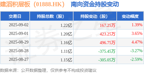 证券之星消息,9月2日南向资金增持167.25万股建滔积层板(01888.HK)。近5个交易日中,获南向资金增持的有3天,累计净增持406.75万股。近20个交易日中,获南向资金增持的有12天,累计净增持4407.7万股。截至目前,南向资金持有建滔积层板(01888.HK)1.22亿股,占公司已发行普通股的3.9%。