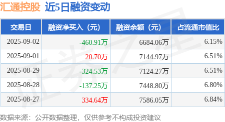 证券之星消息,9月2日,汇通控股(603409)融资买入262.19万元,融资偿还723.1万元,融资净卖出460.91万元,融资余额6684.06万元。