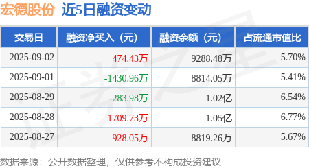 证券之星消息,9月2日,宏德股份(301163)融资买入1788.55万元,融资偿还1314.11万元,融资净买入474.43万元,融资余额9288.48万元。