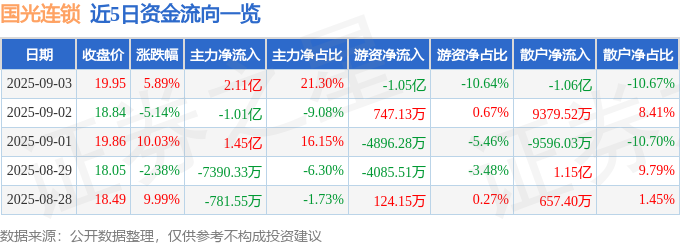 证券之星消息,截至2025年9月3日收盘,国光连锁(605188)报收于19.95元,上涨5.89%,换手率9.76%,成交量48.95万手,成交额9.9亿元。