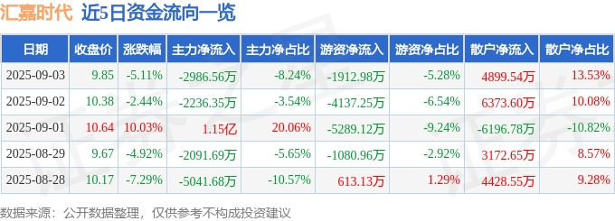 证券之星消息,截至2025年9月3日收盘,汇嘉时代(603101)报收于9.85元,下跌5.11%,换手率7.55%,成交量35.52万手,成交额3.62亿元。