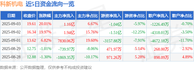 证券之星消息,科新机电9月3日涨停收盘,收盘价19.61元。该股于13点10分涨停,3次打开涨停,截止收盘封单资金为2670.58万元,占其流通市值0.65%。