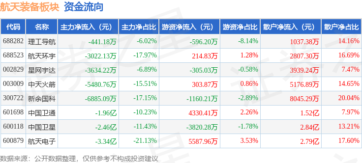 从资金流向上来看,当日航天装备板块主力资金净流出9.7亿元,游资资金净流入4555.36万元,散户资金净流入9.25亿元。航天装备板块个股资金流向见下表: