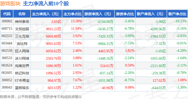 从资金流向上来看,当日游戏板块主力资金净流入1.78亿元,游资资金净流入1379.61万元,散户资金净流出1.92亿元。游戏板块个股资金流向见下表: