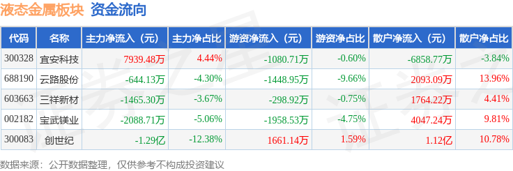 从资金流向上来看,当日液态金属板块主力资金净流出9156.65万元,游资资金净流出3125.97万元,散户资金净流入1.23亿元。液态金属板块个股资金流向见下表: