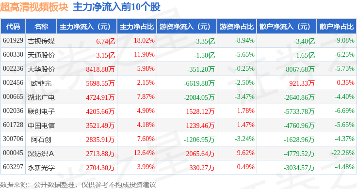 从资金流向上来看,当日超高清视频板块主力资金净流出24.3亿元,游资资金净流入1.63亿元,散户资金净流入22.67亿元。超高清视频板块个股资金流向见下表: