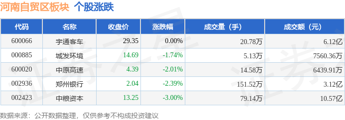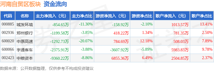 从资金流向上来看,当日河南自贸区板块主力资金净流出1.51亿元,游资资金净流入4291.44万元,散户资金净流入1.08亿元。河南自贸区板块个股资金流向见下表: