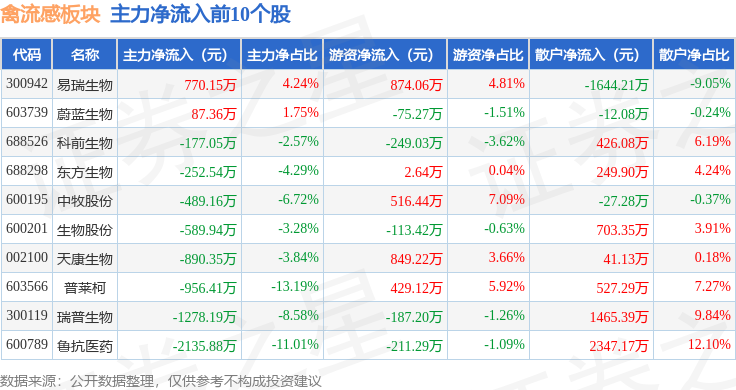 从资金流向上来看,当日禽流感板块主力资金净流出1.49亿元,游资资金净流入3058.9万元,散户资金净流入1.19亿元。禽流感板块个股资金流向见下表: