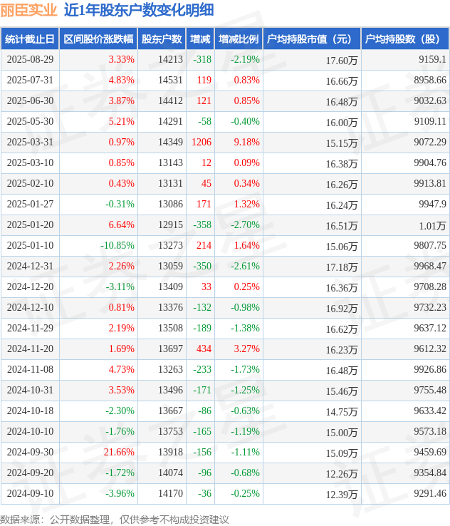 从股价来看,2025年7月31日至2025年8月29日,丽臣实业区间涨幅为3.33%,在此期间股东户数减少318.0户,减幅为2.19%。