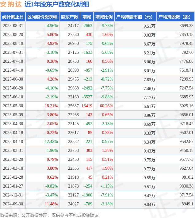 从股价来看,2025年8月20日至2025年8月31日,安 纳 达区间跌幅为4.96%,在此期间股东户数减少2663.0户,减幅为9.73%。