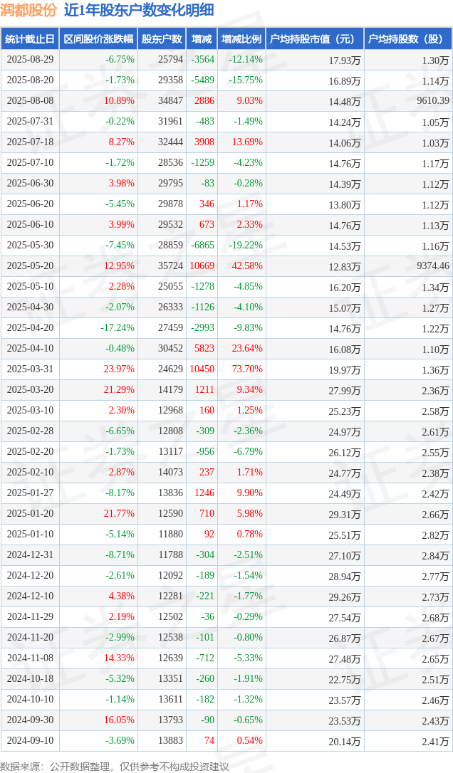 从股价来看,2025年8月20日至2025年8月29日,润都股份区间跌幅为6.75%,在此期间股东户数减少3564.0户,减幅为12.14%。