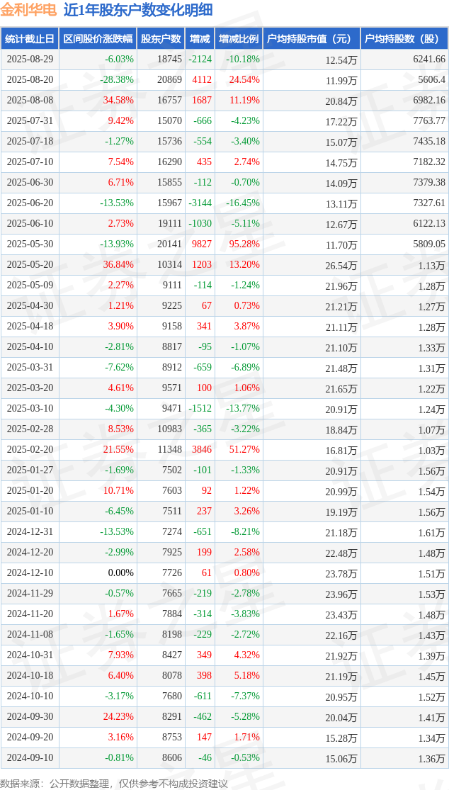 从股价来看,2025年8月20日至2025年8月29日,金利华电区间跌幅为6.03%,在此期间股东户数减少2124.0户,减幅为10.18%。