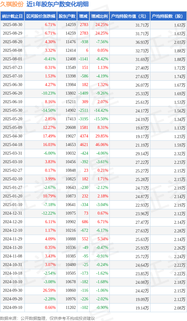 从股价来看,2025年8月20日至2025年8月30日,久祺股份区间涨幅为6.71%,在此期间股东户数增加2783.0户,增幅为24.25%。
