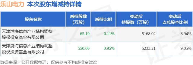 证券之星消息,9月3日乐山电力发布公告《乐山电力:乐山电力股份有限公司关于持股5%以上股东权益变动触及1%刻度的提示性公告》,其股东天津渤海信息产业结构调整股权投资基金有限公司于2025年7月8日至2025年9月3日间合计减持615.19万股,占公司目前总股本的1.0637%,变动期间该股股价下跌31.39%,截止9月3日收盘报11.56元。